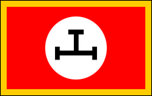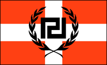 Imperial Fascist League (Vereinigtes Königreich) Dies war die Flagge der Imperial Fascist League (IFL), einer britischen faschistischen Bewegung, die zwischen 1928 und 1939 von Arnold Spencer Leese angeführt wurde. Die IFL war eine kleine Gruppe mit nie mehr als ein paar hundert Mitgliedern. Sie trugen schwarze Hemden und waren für Straßenschlachten organisiert. Ursprünglich verwendeten sie die Fasces als Symbol, übernahmen jedoch das Hakenkreuz, das auf der Unionsflagge angebracht war, nachdem Adolf Hitler in Deutschland an die Macht gekommen war. Die Gruppe stand in harter Konkurrenz mit der British Union of Fascists, mehr als einmal kam es zu Straßenschlachten zwischen den beiden Extremistengruppen. Schließlich erwies sich die BUF als zu stark und 1939 war die IFL weitgehend verschwunden. Ihre Flagge erlangte kurzzeitig erneute Berühmtheit, als in einer Ausgabe des Newsweek-Magazins von 1997 ein Bild erneut veröffentlicht wurde, das zeigt, wie sie 1938 bei einer Pro-Nazi-Demonstration in London verwendet wurde. Die mit Text modifizierte IFL-Flaggenvariante wurde von der neuen Nationalsozialistischen Bewegung – Britanna (NSM) übernommen. |