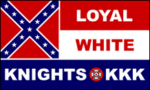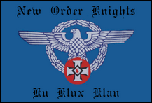 Neue Ordnung der Ku-Klux-Klan-Ritter (USA) Eine weitere kleine Splittergruppe (oder Einzelperson), die behauptet, Teil des KKK zu sein, nennt sich die New Order Knights des Ku Klux Klan. Sie nennen sich selbst die „Armee der blauen Tunika" und behaupten, ihre Mission sei es, das weiße Erbe zu bewahren, damit künftige Generationen ihre Geschichte kennen und daraus lernen können. Damit verkünden sie eine seltsame Kombination aus Antisemitismus, Nationalsozialismus und Christentum Der Nationalsozialismus ist der Weg der arischen Krieger, doch sagen sie: „Ihr Engagement besteht darin, zu erziehen, nicht aus Hass, sondern aus Stolz auf die Rasse, der sie angehören." Über diese Gruppe ist nicht viel bekannt. Ihre Flagge hat einen silbernen Adler und einen Kranz, die an die des Dritten Reichs erinnern, auf einem hellblauen Feld zentriert und mit einem KKK-Blutstropfen-Symbol versehen, wo man das Hakenkreuz erwarten würde. Über dem Abzeichen stehen die Worte „New Order Knights" in schwarzer Schrift, darunter die Worte „Ku Klux Klan". |