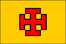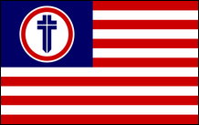 Der Ku Klux Klan, LLC 2003 (USA) Die Ku Klux Klan Limited Liability Company (KKK LLC) mit Hauptsitz in Compton, Arkansas, ist ein weiterer Versuch, den KKK zu legitimieren. Eine Gesellschaft mit beschränkter Haftung (Limited Liability Company, LLC) ist eine Rechtsform einer Kapitalgesellschaft, die ihren Eigentümern eine beschränkte Haftung gewährt. Dieser Zweig des KKK ist im Bundesstaat Arkansas zugelassen und arbeitet im Rahmen einer legalen Unternehmensstruktur. Er behauptet, dass seine Handlungen alle völlig legal und korrekt seien. Sie zahlen Steuern, führen legitime Finanzaufzeichnungen über alle ihre Aktivitäten und behaupten, nur als Ressource für die Klan-Philosophie und ihre Bedeutung zu fungieren. Das Emblem in der Mitte ihrer Flagge ist das „Triple Tau". Sie behaupten, es sei ein Symbol des Christentums aus der Zeit Christi. Laut Klan stellt das Kreuzsymbol (ein von einem T halbiertes H) das Kreuz, Gott und Christus dar. Bei einer Variante dieser Flagge fehlt der goldene Rand, der das rote Feld umgibt. |