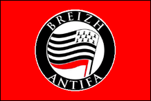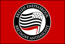 Die meisten europäischen Antifa- Bewegungen verwenden dasselbe Emblem und dieselbe Flagge, mit entsprechenden Modifikationen. die Flaggen des bretonischen Zweigs der Action Antifasciste Ein gutes Beispiel dafür sind . Beachten Sie, dass die schwarze Flagge durch eine bretonische Flagge ersetzt wurde, die vor der roten Flagge platziert ist. Auf der ersten Flagge trägt der Ring den kürzeren Namen der Gruppe Breizh Antifa . Auf der zweiten ist der vollständige Name sowohl auf Bretonisch ( Breizh Enepfaskour ) als auch auf Französisch ( Bretagne Antifasciste ) eingraviert. |