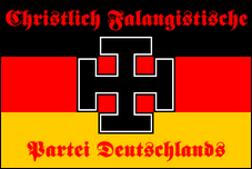Amerikanische Nationalsozialistische Partei (USA) Hierzulande kommt es immer wieder zu Spaltungen der Neonazis und der Bildung neuer Fraktionen. Die American National Socialist Party (ANSP) ist eine solche Splittergruppe. Ihr Motto lautet: „Aus der Asche auferstehen und die weiße Rasse einzeln wieder aufbauen." Sie unterhalten mehrere ähnliche Websites, darunter „The one and only true Aryan Nations" und eine weitere für eine Jugendgruppe namens „ The Werewolf Youth Legion ". Ihr Hauptsitz ist Chillicothe, Ohio. Die ANSP-Flagge erinnert ein wenig an die Flagge der kurzlebigen Westdeutschen Sozialistischen Reichspartei Deutschlands der frühen 1950er Jahre. Es hat ein rotes Feld mit einem furchterregend aussehenden schwarzen Adler in der Mitte. Der Adler ist mit einem gekreuzten Schwert und einem Blitz unkenntlich gemacht und bildet einen Rahmen für die roten Buchstaben ANSP. |