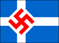 Nationalistische Partei (Island) Nationalistische Partei Die Nationalistische Partei wurde 1934 durch den Zusammenschluss der 1933 gegründeten Isländischen Nationalistischen Bewegung (Þjóðhreyfing Íslendinga) und ihrer abtrünnigen Mitglieder – der ursprünglichen Nationalistischen Partei – gegründet. Die Partei glaubte an die Vorherrschaft der Arier und den Antisemitismus und beabsichtigte, Island zu einem korporativistischen Staat zu machen, entwickelte jedoch nie einen Personenkult um einen obersten Führer. Die Mitgliederzahl überstieg nie 450. Der britische Einmarsch in Island im Zweiten Weltkrieg im Jahr 1940 führte zu einem Massenaustritt aus der Partei, die 1944 offiziell aufgelöst wurde. In Island ist die Mitgliedschaft in der Nationalistischen Partei heute eine Angelegenheit der Peinlichkeit und es gibt nur sehr wenige Einwände. einschließlich der Parteifahnen, wurden gerettet, außer vielleicht von einer kleinen Anzahl von Sammlern, die sich für diese Periode der isländischen Geschichte interessieren. Die Nationalistische Partei verwendete zwei verschiedene Flaggen in den Nationalfarben. Die erste Flagge fügte dem Vorschlag aus dem 19. Jahrhundert, aus dem die Nationalflagge abgeleitet wurde, das Hakenkreuz hinzu. Das Hakenkreuz wurde auf einer weißen Raute angebracht und mit dem Kreuz zu einer einzigen Ladung verbunden. Die zweite Flagge hatte ein typisches Nazi-Design mit einem roten Hakenkreuz auf einer weißen Scheibe in der Mitte des blauen Feldes. |