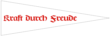 Die Fahnen der Nationalsozialistischen Gemeinschaft „Kraft durch Freude". Kraft durch Freude (KdF, wörtlich „Kraft durch Freude") war eine große staatlich kontrollierte Freizeitorganisation im Dritten Reich, Teil der Deutschen Arbeitsfront (DAF), der damaligen nationalen deutschen Arbeitsorganisation. Gegründet als Instrument zur Vermittlung der Vorteile des Nationalsozialismus an die Bevölkerung, entwickelte es sich in den 1930er Jahren bald zum weltweit größten Tourismusunternehmen. Die Organisation hatte das selbsterklärte Ziel, „eine nationalsozialistische Volksgemeinschaft und die Vervollkommnung und Verfeinerung des deutschen Volkes" zu schaffen. Ziel war es, dieses Ziel durch die Organisation straffer und gründlich strukturierter Freizeitprogramme zu erreichen. Neben vielen Freizeitaktivitäten wie Konzerten, Theaterstücken, Bibliotheken, Tagesausflügen und Ferien wurden Schiffskreuzfahrten organisiert. Zu diesem Zweck wurden spezielle Schiffe gebaut, um die Gäste zu Orten in ganz Europa, insbesondere nach Norwegen, zu bringen. KdF-Schiffswimpel Als Unterorganisation der Deutschen Arbeitsfront zeigte die KdF auf ihren Fahnen ein Zahnrad, von dem schwarze Sonnenstrahlen ausgingen. Von der allgemeinen Flagge gab es Varianten, die ein rotes Hakenkreuz zeigten oder den weißen Kreis verließen. Die auf Schiffen verwendeten Flaggen hatten einen weißen Hintergrund mit roten Sonnenstrahlen, während die bei Sportveranstaltungen verwendeten Flaggen zusätzlich einen roten Rand sowie ein rotes Hakenkreuz hatten. Es gab auch einen speziellen Schiffswimpel, der oben am Großmast angebracht wurde. Es zeigte in roten gotischen Buchstaben den Namen der Gemeinde. |