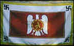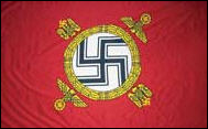 Standarte des Führers und Nationalkanzlers Dies war die persönliche Standarte Adolf Hitlers zwischen 1935 und 1945. Obwohl sie offiziell „Deutsche Nationalkanzlerstandarte" genannt wurde, war Hitler der einzige Kanzler, der sie jemals verwendete. Auf Reichsparteitagen und Bundesfeierlichkeiten der NSDAP wurde es üblicherweise mit einem aufrechten Stab an der linken Seite getragen. Verzerrte Nachbildung von Flaggen Es ist auch mit rotem und braunem Hintergrund zu finden |