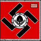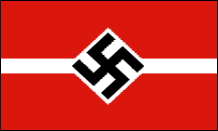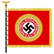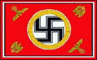 Flagge der NSDAP 1920-1945 Dies war die Flagge der NSDAP (Nationalsozialistische Deutsche Arbeiterpartei). Im Jahr 1935, nach der Machtergreifung Hitlers, wurde sie auch zur deutschen Staatsflagge, mit einer Änderung: Die weiße Scheibe und das Hakenkreuz befanden sich auf der Nationalflagge leicht außermittig (zum Hissen hin). Alle nach 1935 verwendeten Mittelscheibenversionen der Flagge waren Parteiflaggen der NSDAP. Die berüchtigte „Blutfahne" aus dem Münchner Bierhallen-Putsch von 1923 war eine dieser Flaggen. Die Blutfahne selbst war eine von mehreren, die Hitlers Anhänger bei seinem ersten gescheiterten Machtergreifungsversuch in München trugen, bei dem seine demonstrierenden „Sturmtruppen" von der Münchner Polizei beschossen wurden. Hitler floh, wurde jedoch von der Polizei festgenommen und schließlich für ein Jahr inhaftiert. Da die Blutfahne den Nahkampf nur mit einer Träne überlebte, wurde ihr anschließend der Status eines „heiligen Gegenstands" verliehen. |