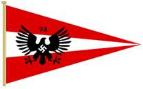 Flaggen der Nazi-SA-Sturmkompanie/Regiment Dies sind Beispiele für Flaggen, die von den Bataillonen und Kompanien der SA-Regimenter „Leibwächter" ( Sturmabteilung oder „Schutz- und Sportabteilung") verwendet werden. Die kleinen schwarzen, blauen, grünen oder silbernen Quadrate in den oberen linken Ecken enthalten die Ziffern, die Bataillone und Kompanien (römische Ziffern) und Regimenter (arabische Ziffern) bezeichneten. Sturmflagge einer SA-Reiterkompanie (Kavallerie). Diese SA-Einheiten waren ursprünglich die Leibwächter von Adolf Hitler, bevor er sie durch seine SS-Leibwächter ersetzte. Die mächtige SA-Führung und der größte Teil von Hitlers Opposition wurden nach der „Nacht der langen Messer" oder „Operation Kolibri", einer Säuberungsaktion, die zwischen dem 30. Juni und dem 2. Juli 1934 im nationalsozialistischen Deutschland stattfand, vollständig zerstört. Der Allgemeine Wimpel der SA wurde aus verschiedenen Gründen von der SA ( Sturmabteilung ) als „generischer" Wimpel verwendet, unter anderem auf Kotflügeln von Fahrzeugen, die SA-Führer bei ihrem „offiziellen" Geschäft, dem SA-Reitersturm, transportierten ( SA-Reiter/Berittene Kavallerie) wurden hauptsächlich für Zeremonien und Paraden eingesetzt, und die Sturmfahne der Marine-SA wurde natürlich auch auf dem Wasser verwendet. |