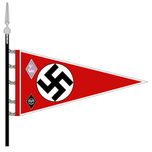 Wimpel des Bundes Deutscher Mädchen (BDM). Wimpel der Young Girls League (JM - Jungmädel). Ein Äquivalent zur Hitlerjugend war der BDM, die weibliche Sektion der deutschen Jugendorganisationen. Alle diese Einheiten, mit Ausnahme der Beauty Society, waren mit Wimpeln anstelle von Flaggen ausgestattet. Der Bund bestand zunächst aus zwei Sektionen: dem Jungmädel (JM) für Mädchen im Alter von 10 bis 14 Jahren und dem eigentlichen Bund (BDM) für Mädchen im Alter von 14 bis 18 Jahren. Im Jahr 1938 Es wurde eine dritte Sektion eingeführt, die „Werk Glaube und Schönheit", die freiwillig war und Mädchen im Alter von 17 bis 21 Jahren offen stand. Der BDM nutzte Lagerfeuerromantik, Sommerlager, Folklorismus, Tradition und Sport Mädchen innerhalb des nationalsozialistischen Glaubenssystems zu erziehen und sie für ihre Rollen in der deutschen Gesellschaft auszubilden: Ehefrau, Mutter und Hausfrau. Passend zum Männerbereich hatten auch die Mädchen ihre spezifischen Flaggen. Allerdings verwendeten die Mädchen nur Wimpel und keine echten Flaggen, wenn sie nicht die allgemeine Flagge des HJ-Repräsentantenhauses verwendeten. Die Beauty Society verwendete keine Flaggen. JM Wimpel