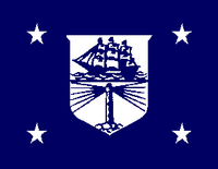 Flagge des Finanzministers 1915-1963 Die aktuelle Rangflagge des Finanzministers hat einen Hintergrund in „altem Glanz"-Blau, manchmal mit goldgelben Fransen. Der Schildhintergrund, die gekreuzten Anker außerhalb des Schildes und die 13 Haubensterne sind alle in Weiß gehalten. Im Inneren des Schildes sind die Waagen über dem Chevron, der Chevron und der traditionelle Schatzschlüssel unter dem Chevron alle in altglänzendem Blau gehalten. Die aktuelle Flagge des Finanzministers scheint nicht die üblichen vier Sterne in den Ecken zu haben. |