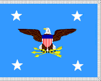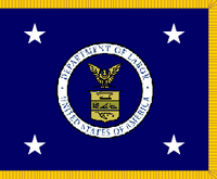 Flagge des Außenministers Der vom Präsidenten mit Rat und Zustimmung des Senats ernannte Außenminister ist der wichtigste außenpolitische Berater des Präsidenten und die erste Kabinettsposition, die 1789 von Präsident George Washington eingerichtet wurde (was zeigt, wie [selten] manche Dinge wichtiger sind als Geld). Der Außenminister führt die Außenpolitik des Präsidenten über das Außenministerium und den Auswärtigen Dienst der Vereinigten Staaten durch. Die Flagge des Außenministers wurde erstmals 1920 von Präsident Wilson genehmigt. Der Anlass war die bevorstehende Abreise des Außenministers zu einer Reise nach Südamerika als Sonderbeauftragter des Präsidenten, bei der der Außenminister auf einem Schiff der US-Marine reisen würde. Die Flagge war blau mit einer Darstellung des US-Wappens in Gold, flankiert von zwei goldenen Sternen. Diese ursprüngliche Flagge wurde 1933 unter der Regierung von Präsident Roosevelt in die heutige Flagge umgestaltet. |
