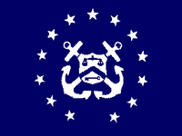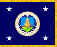 Flagge des Handelsministers Der Handelsminister der Vereinigten Staaten ist der Leiter des Handelsministeriums der Vereinigten Staaten. Seine Aufgabe ist es, den Präsidenten bei der Formulierung der Geschäfts- und Industriepolitik zu unterstützen. Bis 1913 gab es einen Minister für Handel und Arbeit, wodurch diese Abteilung mit dem Arbeitsministerium vereint wurde, das nun von einem separaten Arbeitsminister geleitet wird. Die Flagge des Handelsministers ist blau mit dem Abteilungsschild in Weiß mit blauen Ladungen (hauptsächlich ein vollgetakeltes Schiff unter Segeln und an der Basis ein Leuchtturm); in jeder Ecke ein weißer Stern. Es wurde 1986 zur Verwendung zugelassen. |