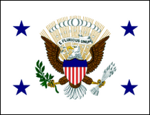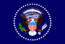 Flagge des Präsidenten der Vereinigten Staaten Diese Flagge wird für den Präsidenten der Vereinigten Staaten von Amerika gehisst, den höchsten gewählten Beamten und Geschäftsführer der Vereinigten Staaten. Er gilt außerdem als Oberbefehlshaber aller Streitkräfte der Vereinigten Staaten und leitet die Exekutive der Regierung. Seine Hauptberater heißen Sekretäre und sind Mitglieder seines „Kabinetts". Der Präsident ernennt mit Zustimmung des Kongresses die Mitglieder seines Kabinetts, die wiederum für den Präsidenten die verschiedenen Abteilungen und Behörden der Regierung leiten. Seine Flagge (erstmals 1877 verwendet) zeigt das „Siegel des Präsidenten" (genehmigt 1945), das auf dem Großen Siegel der Vereinigten Staaten basiert, auf einem blauen Feld, umgeben von 50 Sternen. Die einzigen Änderungen seit 1945 erfolgten in den Jahren 1959 und 1960, als nach der Aufnahme von Alaska und Hawaii als Bundesstaaten der Kreis um den 49. und 50. Stern erweitert wurde. Innenvarianten der Präsidentenflagge werden häufig mit goldenen Fransen versehen. |