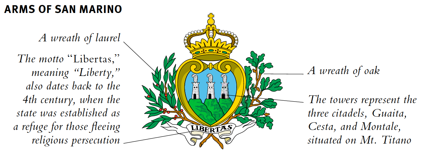 Die Flagge von San Marino stammt aus dem Jahr 1797 und wurde 1799 von Napoleon als die eines unabhängigen Staates anerkannt. Die Farben wurden vom Wappen übernommen und im 18. Jahrhundert eingeführt. Blau soll den Himmel über San Marino darstellen und Weiß die Wolken und den Schnee auf dem Titano. Das traditionelle Wappen wird nur zu offiziellen Zwecken in der Mitte der Flagge platziert. Es zeigt drei weiße Türme, die mit Straußenfedern gekrönt sind und drei Zitadellen darstellen, die auf dem Gipfel des Berges ruhen. Titano, der einst mit Straußenfedern behängt war. Sie symbolisieren die Fähigkeit des Staates, sich zu verteidigen.