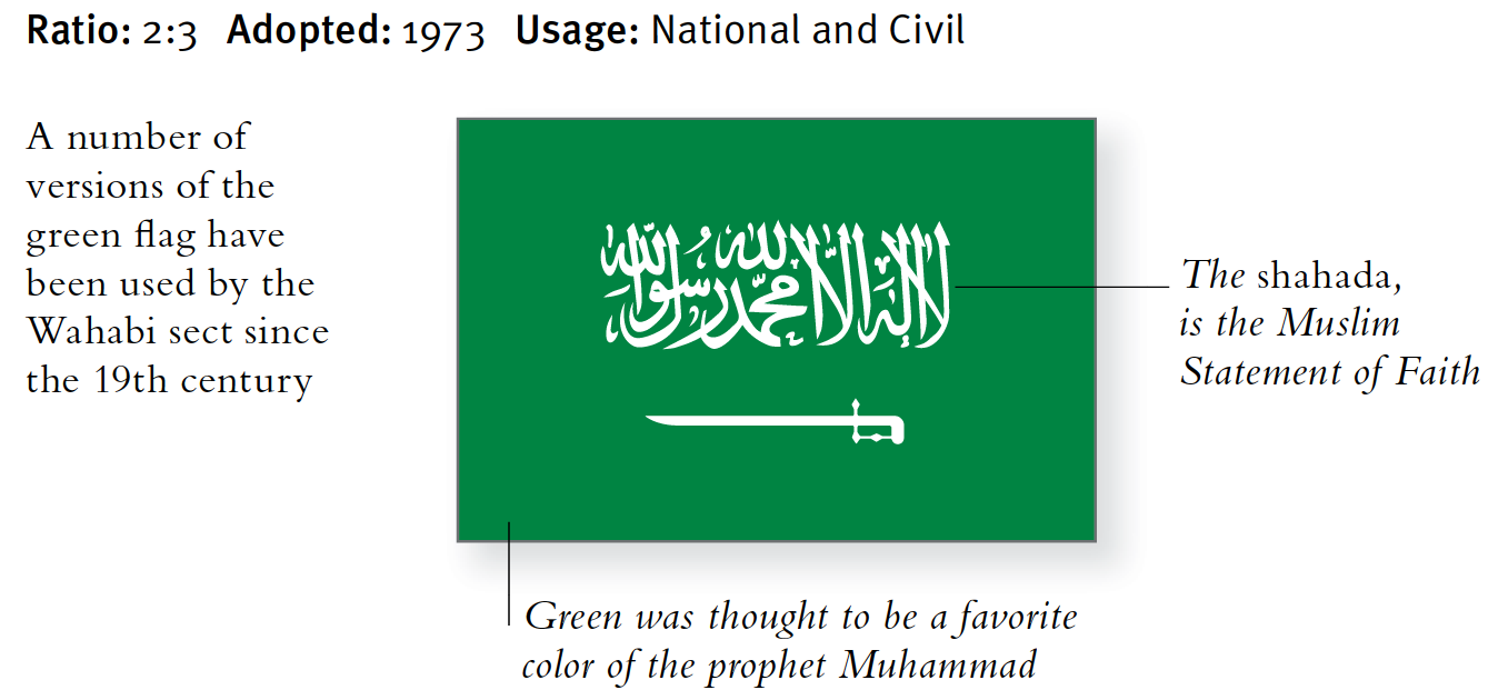Die Flagge Saudi-Arabiens symbolisiert die arabischen Völker der Wüste. Grün wird seit dem späten 19. Jahrhundert in verschiedenen Formen verwendet, wird von der Wahabi-Sekte bevorzugt und gilt als die Lieblingsfarbe des Propheten Mohammed.