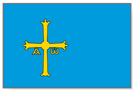 Blau ist die Farbe der Jungfrau Maria. Das Kreuz ist das Siegeskreuz, ein traditionelles asturisches Emblem. Daran hängen griechische Buchstaben, die Christus, den Anfang und das Ende symbolisieren.