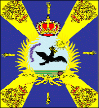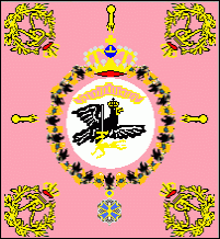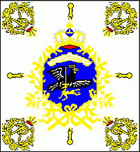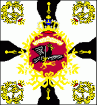 Das Garnisonsregiment Nr. 9 Leibfahne war das gleiche wie das Garnisonsregiment Nr. 7, also weiß mit goldenen Abzeichen.