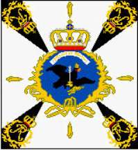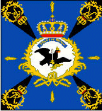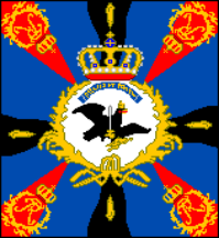 Die Regimenter trugen jeweils zwei Flaggen pro Bataillon. Die erste Flagge war die Leibfahne oder „Oberstfarben", die zweite Flagge eine Regimentsfahne oder „Regimentsfarben". Die Flaggen waren alle 140 cm hoch und 120 cm breit. Die Stabköpfe waren speerförmig und trugen normalerweise das königliche Monogramm. In den meisten Fällen waren sie aus Gold, obwohl einige Spezialeinheiten silberne hatten. Bänder und Quasten waren normalerweise silbern mit schwarzen Streifen. Preußische Flaggen wurden auf Stoff gemalt, und da die Farbe durchnässte, war das Muster auf der einen Seite normalerweise das Spiegelbild der anderen. Normalerweise wandte der Adler den Blick vom Stab ab. |