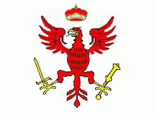 Charlottenburg war bis 1920 eine Stadt westlich von Berlin und wurde dann ein Bezirk von Groß -Berlin . Seine Milizflagge war rot mit einer Chiffre von Friedrich I. in der unteren rechten und oberen linken Ecke. In den beiden anderen Ecken befindet sich die Chiffre „SC" für Sophie Charlotte, die der Stadt ihren Namen gab. In der Mitte der Flagge befindet sich das Wappen von Charlottenburg. |