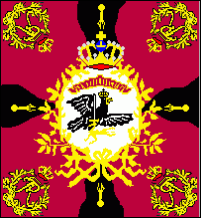 Preußische Militärstandarten und -farben Die ersten Flaggen und Standarten, die von frühen Infanterieregimenten der Markgrafschaft Brandenburg (frühes Brandenburg) getragen wurden, trugen normalerweise einen roten Adler, aber kurz nachdem Brandenburg ein Vereinigtes Königreich wurde und als Preußen bekannt wurde, wurde die Farbe des Adlers in Schwarz geändert, obwohl Eine der höchsten Auszeichnungen, die ein Preuße erhalten konnte, war weiterhin der „Rote Adlerorden".