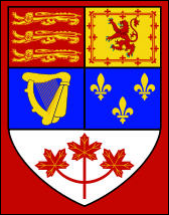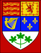 | Canadian Shield seit 1965 (offiziell) Der Schild ist in fünf Abschnitte unterteilt. Die erste Abteilung oben links für den Betrachter enthält die drei goldenen Löwen, die mindestens seit der Herrschaft von König Richard I. ein Symbol Englands sind. Das zweite Viertel zeigt den in Schottland grassierenden roten Löwen in einer doppelten Tressure-Bordüre mit Fleurs-de- lis, das mindestens seit der Herrschaft Wilhelms I. als Symbol Schottlands verwendet wird. Das dritte Viertel zeigt die irische Harfe von Tara. Die goldenen Lilien des königlichen Frankreichs, das erste nachmittelalterliche europäische Emblem, das Jacques Cartier während seiner Landung in Gaspé in Kanada hisste, füllen das vierte Viertel. Die fünfte Ladung, ein Zweig roter Ahornblätter an der Unterseite, ist ein eindeutig kanadisches Symbol, das im Laufe des 19. Jahrhunderts nach und nach mit dem Land identifiziert wurde. |