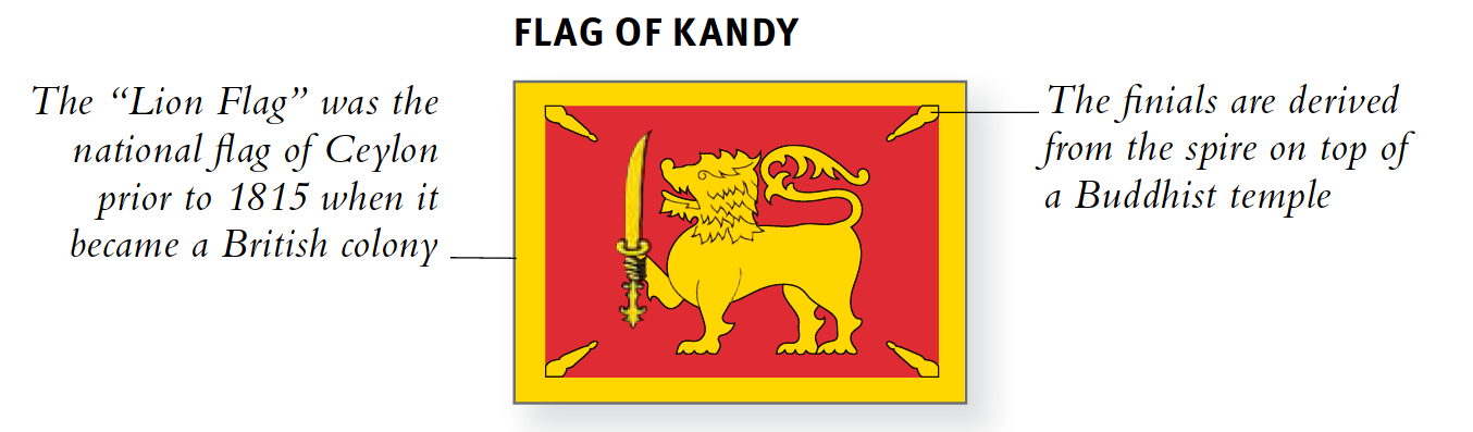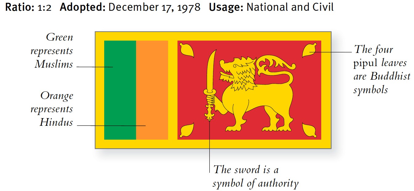 Die ursprüngliche Flagge Sri Lankas zeigte nur den Löwen und das Schwert auf einem roten Feld und erinnerte daran, dass das singhalesische Wort für Löwe – „Singhalesisch" – die Grundlage des Namens der Insel ist. Der gelbe Rand der Flagge symbolisierte den Schutz der Nation durch den Buddhismus. Die Flagge wurde von der Flagge des singhalesischen Königreichs Kandy abgeleitet. Es erwies sich bei der Minderheit als unpopulär Gruppen, also vertikale Streifen in Grün für Muslime und Orange für die Hindu-Tamilen, wurden 1951 hinzugefügt. Als sich der Name des Landes 1972 von Ceylon in Sri Lanka änderte, wurden vier Blätter hinzugefügt. Sie bezeichnen den Baum, unter dem Siddhartha saß, als er die Erleuchtung erhielt und zum Buddha wurde. Diese Version der Flagge wurde ab 1978 offiziell verwendet.
