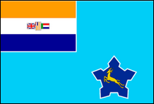 Südafrikanische Luftwaffe 1958-1967 Im Jahr 1958, kurz nachdem die Streitkräfte der Union ein fünfzackiges Burgemblem als Rangabzeichen als Ersatz für die britische Krone eingeführt hatten, führte die südafrikanische Luftwaffe eine neue Flagge ein. Sie unterschied sich von der vorherigen Flagge dadurch, dass das Rondell, das den springenden Springbock umgab, durch den Grundriss des Schlosses der Guten Hoffnung in Dunkelblau mit weißem Rand und dem springenden Springbock in Gold ersetzt wurde. |