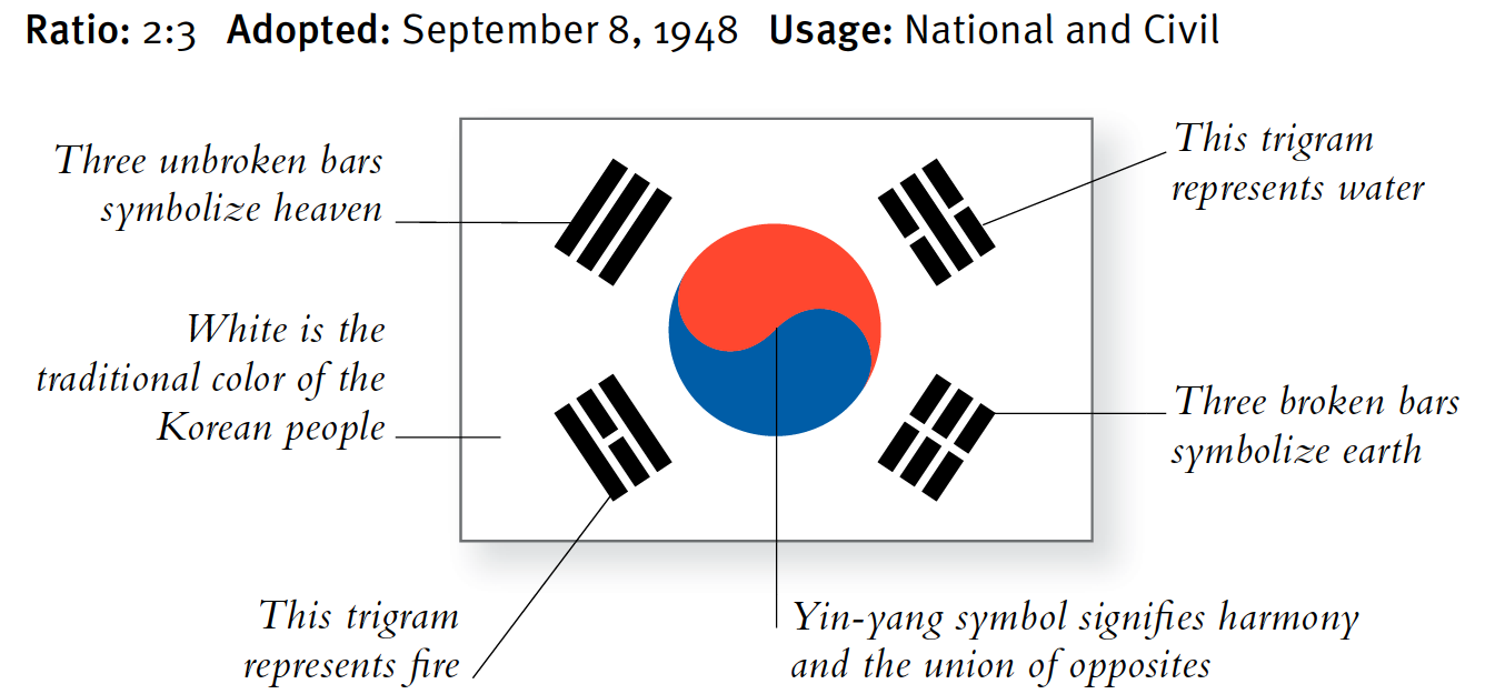 EINE NEUE SÜDKOREANISCHE FLAGGE In der Mitte der Flagge befindet sich eine Scheibe mit einer S-förmigen Linie, deren obere Hälfte rot und die untere Hälfte blau ist. Dies leitet sich vom östlichen Yin-Yang-Symbol ab, das die Harmonie der Gegensätze in der Natur darstellt, zum Beispiel Gut und Böse; männlich und weiblich. Als sich Nord- und Südkorea trennten, wurde die Form des Yin-Yang stilisiert Form eines japanischen Mon. Dabei handelt es sich um vereinfachte Versionen von Alltagsgegenständen, dargestellt in symmetrischer und regelmäßiger Form. Yang wird durch Rot und Yin durch Blau dargestellt. Die andere Änderung an der ursprünglichen Flagge im Jahr 1948 betraf die Trigramme (Kwae) rund um das Yin-Yang, die von acht auf vier reduziert wurden. Es handelt sich um die Grundtrigramme des I-Ging, einem im Osten weit verbreiteten Weissagungssystem. Auf der südkoreanischen Flagge symbolisieren sie die vier Polaritäten; Himmel (oberer Flügel), Wasser (oberer Flügel), Feuer (unterer Flügel) und Erde (unterer Flügel). Das weiße Feld der Flagge steht für Frieden und die weiße Kleidung, die traditionell vom koreanischen Volk getragen wird.