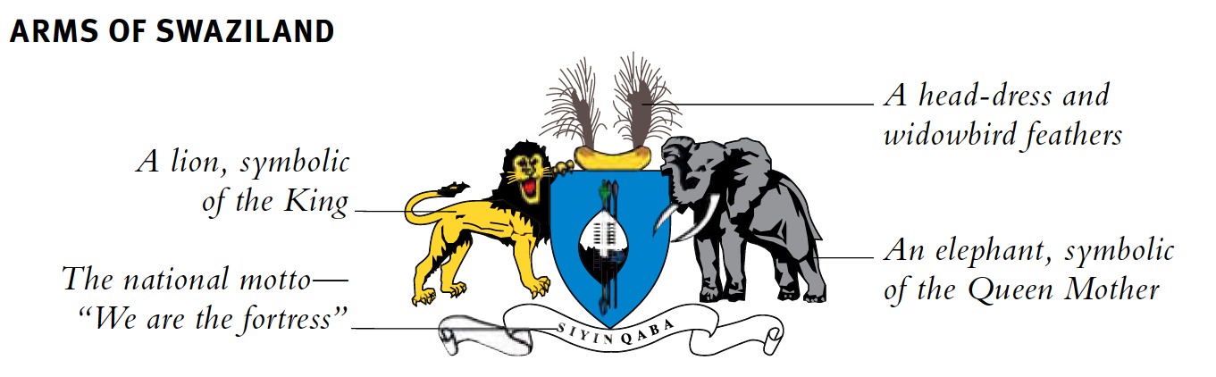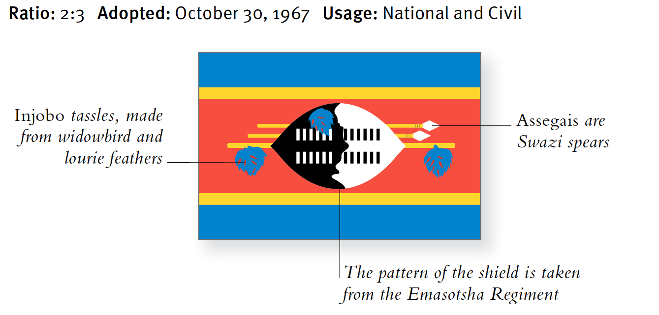 Die Flagge basiert auf einer Flagge, die der verstorbene König Sobhuza II. 1941 dem Swasi-Pionierkorps schenkte. Darauf ist ein Emasotsha-Schild horizontal ausgelegt. Der Schild wird durch einen Stab verstärkt, an dem Injobo-Quasten hängen. Büschel Federn des Witwenvogels und des Lourie. Sie schmücken auch den Schild. Über dem Stab sind zwei Assegais – lokale Speere. Der Schild und die Assegais erscheinen auf dem Nationalwappen, das von einem Löwen und einem Elefanten getragen wird, die den König und die Königinmutter symbolisieren. Das Wappen ist ein Kopfschmuck aus Otterfell, der mit Witwenfedern verziert ist, und das Motto lautet „Siyinqaba", was „Wir sind die Festung" bedeutet.