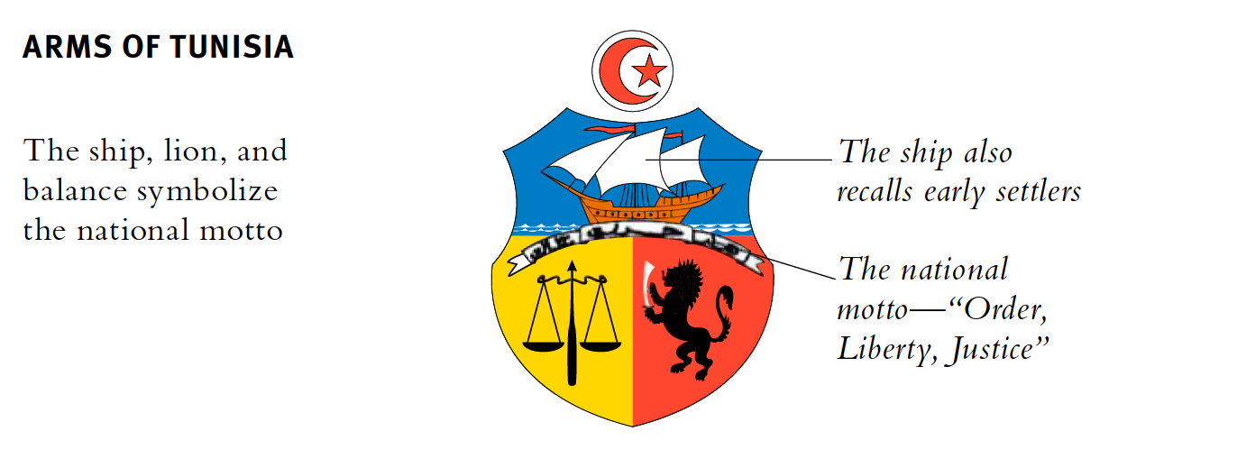 Die Flagge basiert auf der Flagge des Türkischen Reiches und wurde 1835 vom „Bey", dem Erbherrscher Tunesiens, hauptsächlich als Militärflagge übernommen. Während der französischen Regierung (1881-1957) wurde sie zur Seeflagge mit der französischen Trikolore im Kanton; Dies wurde mit der Erlangung der Unabhängigkeit im Jahr 1956 entfernt. Das Wappen Tunesiens wurde seit der Abschaffung der Monarchie, zuletzt im Jahr 1963, geändert und weist ungewöhnlicherweise das Motto auf einer Schriftrolle tatsächlich auf dem Schild auf. Das Motto lautet – auf Arabisch – „Ordnung, Freiheit, Gerechtigkeit". Das Schiff, der Löwe und die Waage wurden von den vorherigen Waffen übernommen.