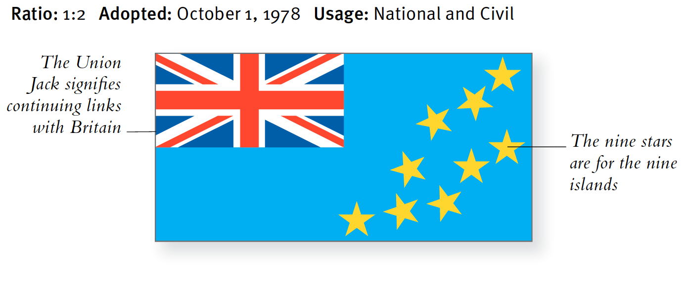 Tuvalu bedeutet „acht Inseln", obwohl es tatsächlich neun sind, von denen jede durch einen Stern auf der Flagge dargestellt wird. Die Anordnung der Sterne soll die geografische Verteilung der Inseln widerspiegeln. Diese Flagge wurde ausgewählt, weil sie die anhaltenden Verbindungen zu Großbritannien und dem Commonwealth symbolisiert. Allerdings nahm die Anti-Commonwealth-Stimmung zu und 1995 beschloss die Regierung, eine neue Flagge ohne Union Jack einzuführen. Die neue Flagge, die später in diesem Jahr eingeführt wurde, behielt die Sterne bei, enthielt aber die Arme in einem Dreieck am Hiss. Im April 1997 wurde der ursprüngliche Entwurf nach einem Regierungswechsel wieder übernommen.
