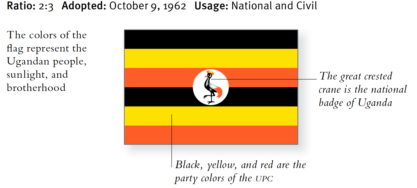 Die dominierende Partei zur Zeit der Unabhängigkeit war der Uganda People's Congress (UPC), und die neue Nationalflagge war eine Adaption ihrer Trikolore mit dem zusätzlichen Kranichabzeichen in der Mitte. Dies geht auf die Zeit vor der Unabhängigkeit zurück, als das koloniale Wahrzeichen Ugandas der große Haubenkranich war. Es tritt auch als einer der Unterstützer Ugandas auf Wappen verliehen am 3. September 1962. Das Wappen zeigt ein lokales Wappen in einer allegorischen Landschaft mit Tee- und Baumwollpflanzen.