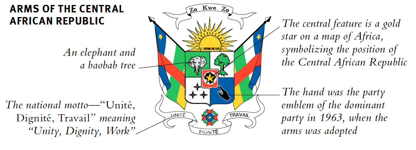Die Flagge ist insofern einzigartig, als sie die panafrikanischen Farben mit denen Frankreichs, der ehemaligen Kolonialmacht, kombiniert. Dies geschah in der Hoffnung, dass Nachbarstaaten einer Föderation unter französischem Schutz beitreten würden, was jedoch nie zustande kam; Der Stern repräsentiert die Hoffnung, dieses Ziel zu erreichen. Der Staat wurde ein Imperium unter Kaiser Bokassa von 1976 bis 1979, an den nationalen Symbolen wurden jedoch keine Änderungen vorgenommen. Das Wappen soll sowohl die Zentralafrikanische Republik als auch ihre wichtige Stellung im Zentrum Afrikas symbolisieren. Die obere Schriftrolle trägt das Motto der ehemaligen Regierungspartei; es bedeutet „Ein Mann ist ein Mann."