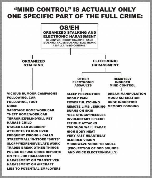 23. Die Belästigung von Zielpersonen verstößt gegen die kanadischen Menschenrechtsgesetze. Zu den schwerwiegendsten Verstößen zählen Gaslighting/Mobbing am Arbeitsplatz, sexuelle Belästigung und rassistisch motivierte Diskriminierung, die im kanadischen Menschenrechtsgesetz ausführlich behandelt werden. Das wichtigste Problem für die betroffenen Personen ist die Verletzung ihrer „Gedankenfreiheit“, da sie rund um die Uhr indirekt durch Stimmen, Geräusche und andere Konversationen, meist mittels Mikrowellen- oder Voice-to-Skull-Technologie, belästigt werden.